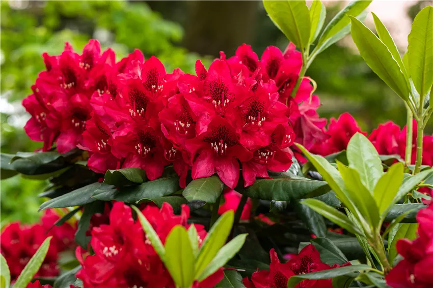 Rhododendron 'Aeschbacher´s Rubin' Wer einen Rhododendron einpflanzen und damit den eigenen Garten gestalten möchte, der wird schon bald den Nächsten pflanzen. Und vielleicht folgt auch noch ein Dritter. Denn Rhododendren wecken bei vielen Gartenbesitzern die Sammelleidenschaft und wer die besonderen Laubgehölze erst einmal für sich entdeckt hat, der wird nie genug von ihnen bekommen. Nicht umsonst gibt es vielerorts ganze Parks, die dem Laugehölz aus Fernost gewidmet sind. Wer also einen Rhododendron einpflanzen und sich in den Garten holen möchte, der macht das am besten im Frühjahr. Zwischen Ende April und Anfang Mai ist die beste Zeit dafür. Dann sind die jungen Pflanzen nicht extremen Temperaturen ausgesetzt und können noch gut anwachsen, bevor es stressig wird. Den richtigen Standort sollte man aber vorher bestimmen, denn ein paar Ansprüche haben die besonderen Schönheiten im Garten.